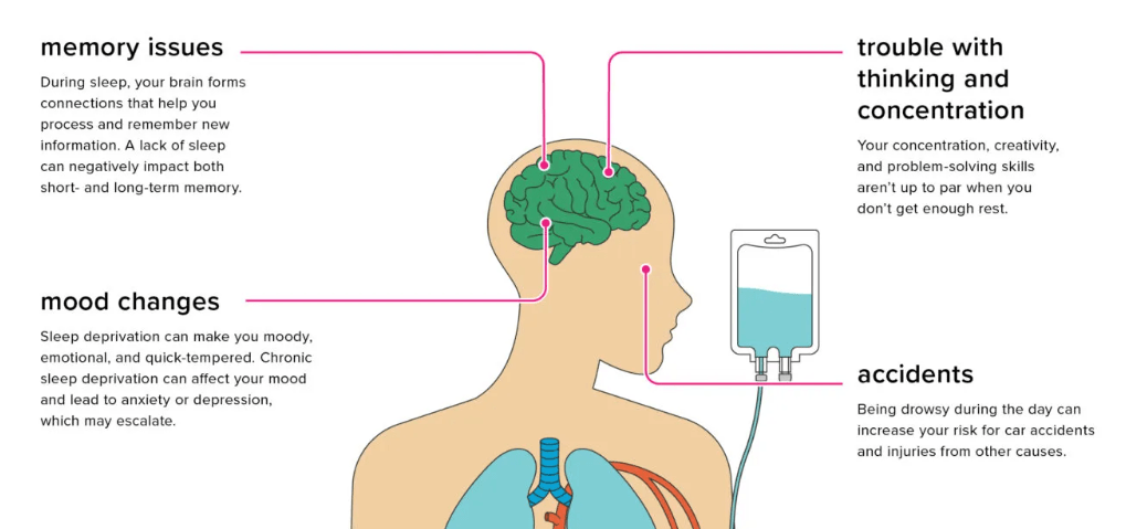 Sleep deprivation also negatively affects your mental abilities and emotional state. You may feel more impatient or prone to mood swings. It can also harm your decision-making and creativity. Other psychological risks include impulsive behavior, anxiety, depression, paranoia, and suicidal thoughts.